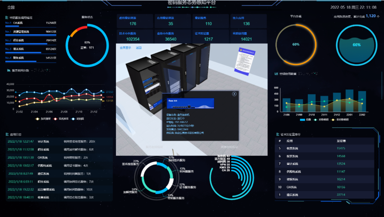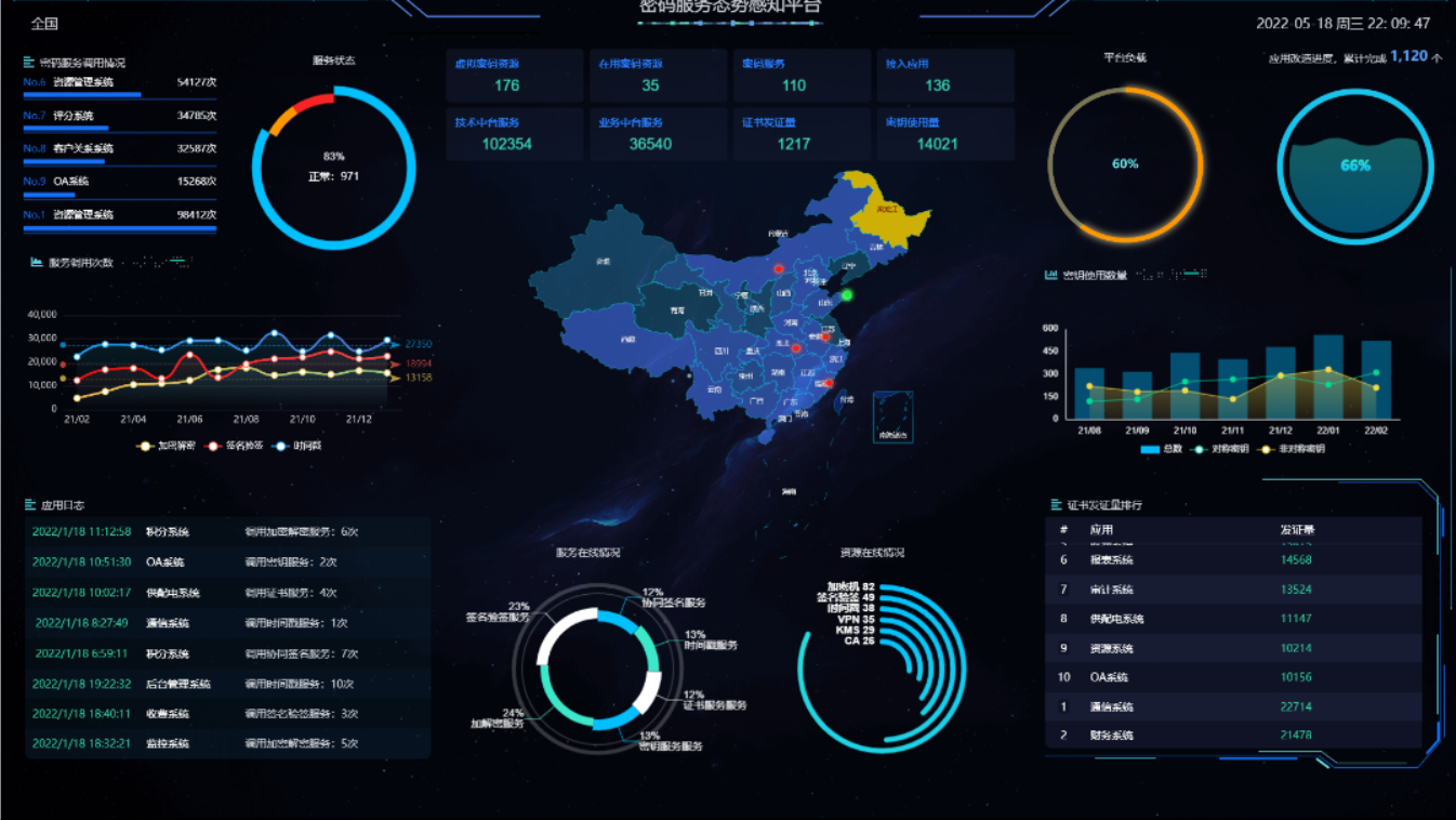 给予行业态势感知和设备运行态势感知内容呈现。行业态势感知包含资产概况、资产数排行、资产类型、各地区密码资产分布、各类资产改造应用等,设备运行态势感知包含设备总台数、资产在线比例、设备在线时长统计、设备分类信息统计、证书发放量、密钥使用量等统计。